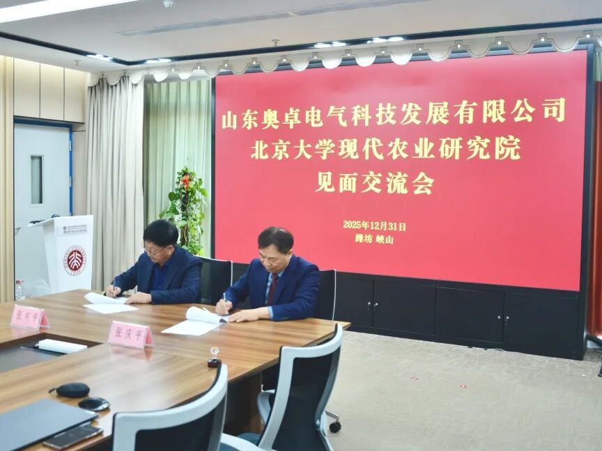 2025年12月31日,山東奧卓電氣科技發(fā)展有限公司董事長(zhǎng)張慶平、常務(wù)副總張曉一行赴北京大學(xué)現(xiàn)代農(nóng)業(yè)研究院參觀交流,雙方深度洽談產(chǎn)業(yè)賦能合作事宜,并正式簽訂“農(nóng)業(yè)科技創(chuàng)新與產(chǎn)業(yè)合作框架協(xié)議”。北大現(xiàn)代農(nóng)業(yè)研究院副院長(zhǎng)張興平、智慧農(nóng)業(yè)實(shí)驗(yàn)室副研究員王昕、智慧農(nóng)業(yè)研究室資深工程師尹兆剛熱情接待并出席簽約儀式。
